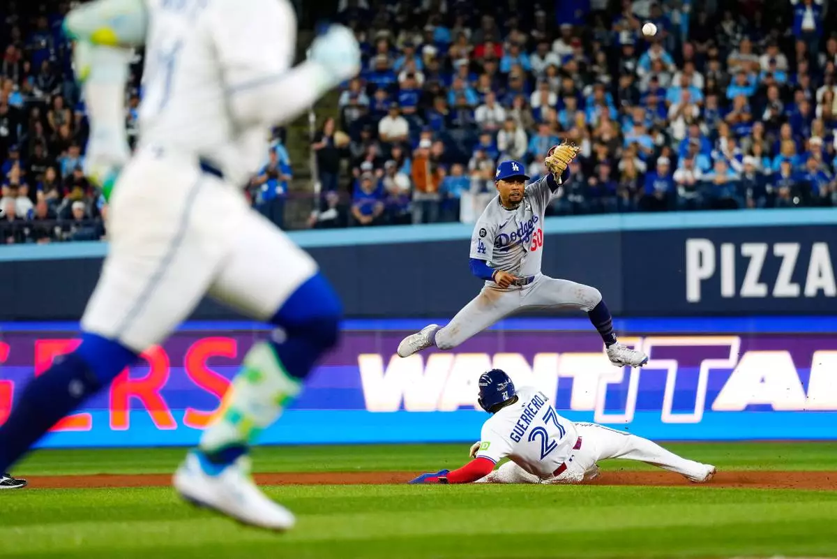 Los Angeles Dodgers shortstop Mookie Betts (50) puts out Toronto Blue Jays' Vladimir Guerrero Jr. (27) at second base as he throws to first to get out Bo Bichette, front left, for a third inning-ending double play during Game 1 of baseball's World Series in Toronto, Friday, Oct. 24, 2025. (Frank Gunn/The Canadian Press via AP)