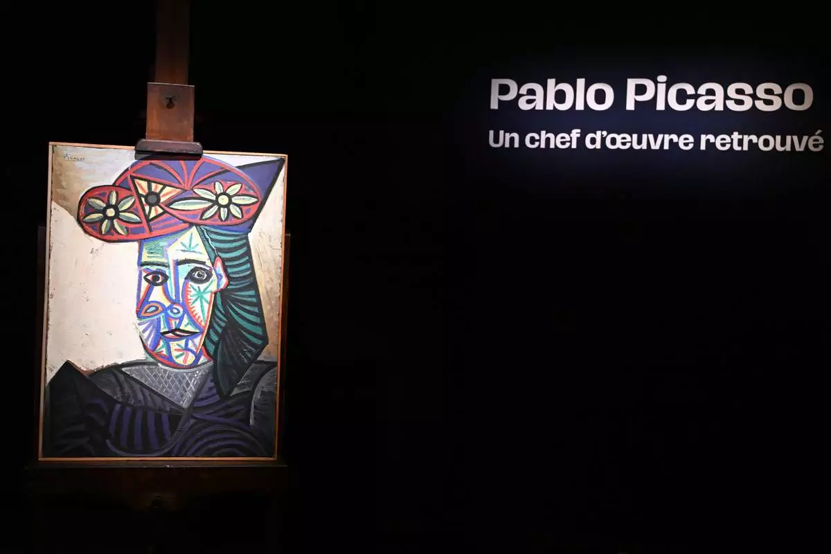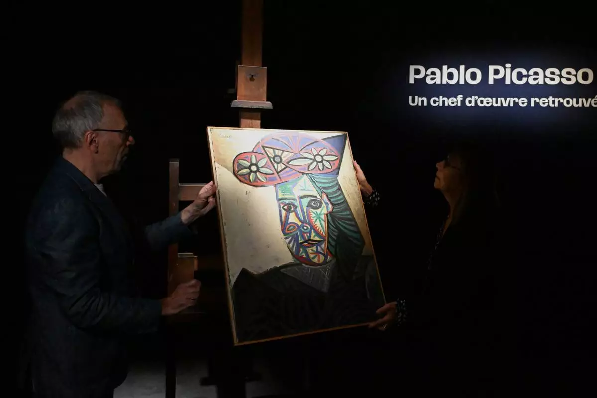 The rediscovered Picasso painting "Bust of a Woman in a Flowery Hat" is presented Wednesday, Oct. 22, 2025 in Paris. The portrait painted in 1943 will be sold at auction Friday in Paris, was bought in 1944 and shows his partner Dora Maar. (AP Photo/Emma Da Silva)