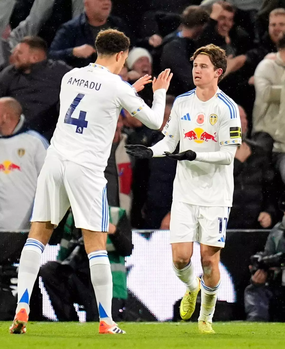 Leeds United's Brenden Aaronson, right, celebrates with Ethan Ampadu after scoring their side's first goal of the game during the English Premier League soccer match between Leeds United and West Ham United in Leeds, England, Friday Oct. 24, 2025. (Danny Lawson/PA via AP)