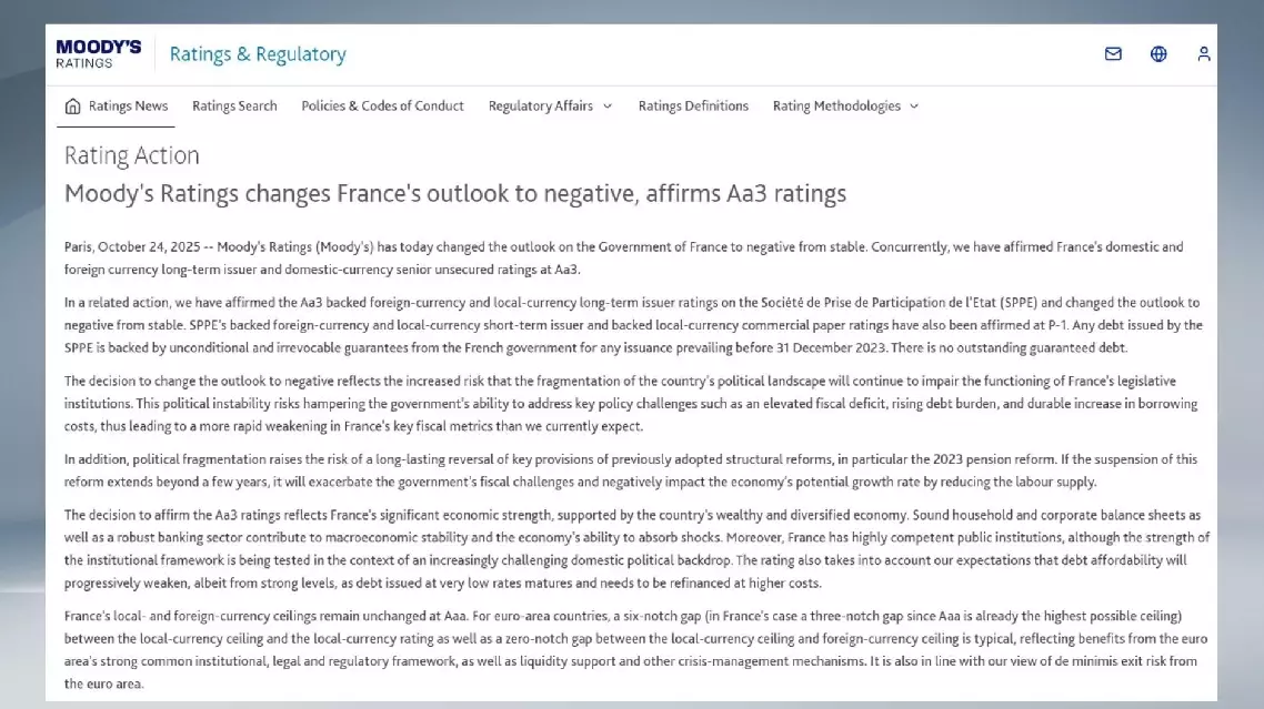 Moody's said in an announcement that the political instability risks hampering the French government's ability to address key policy challenges such as an elevated fiscal deficit, rising debt burden, and durable increase in borrowing costs.