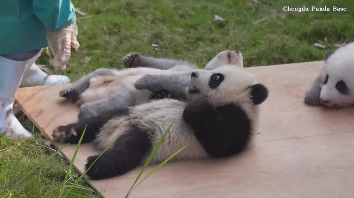 In the newly released video, keepers gently roll the chubby cubs over so they're facing up. The baby bears wiggle their paws and kick their little legs in the air, looking adorably clumsy and full of life — a perfect dose of panda joy from Chengdu.