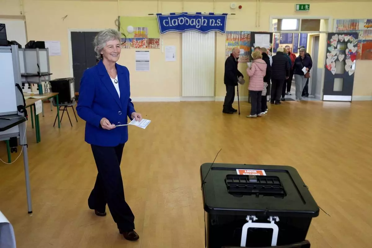 Independent candidate Catherine Connolly casts her vote in the election for the next Irish president at Claddagh National School in Galway city, Ireland, Friday, Oct. 24, 2025. (Brian Lawless/PA via AP)