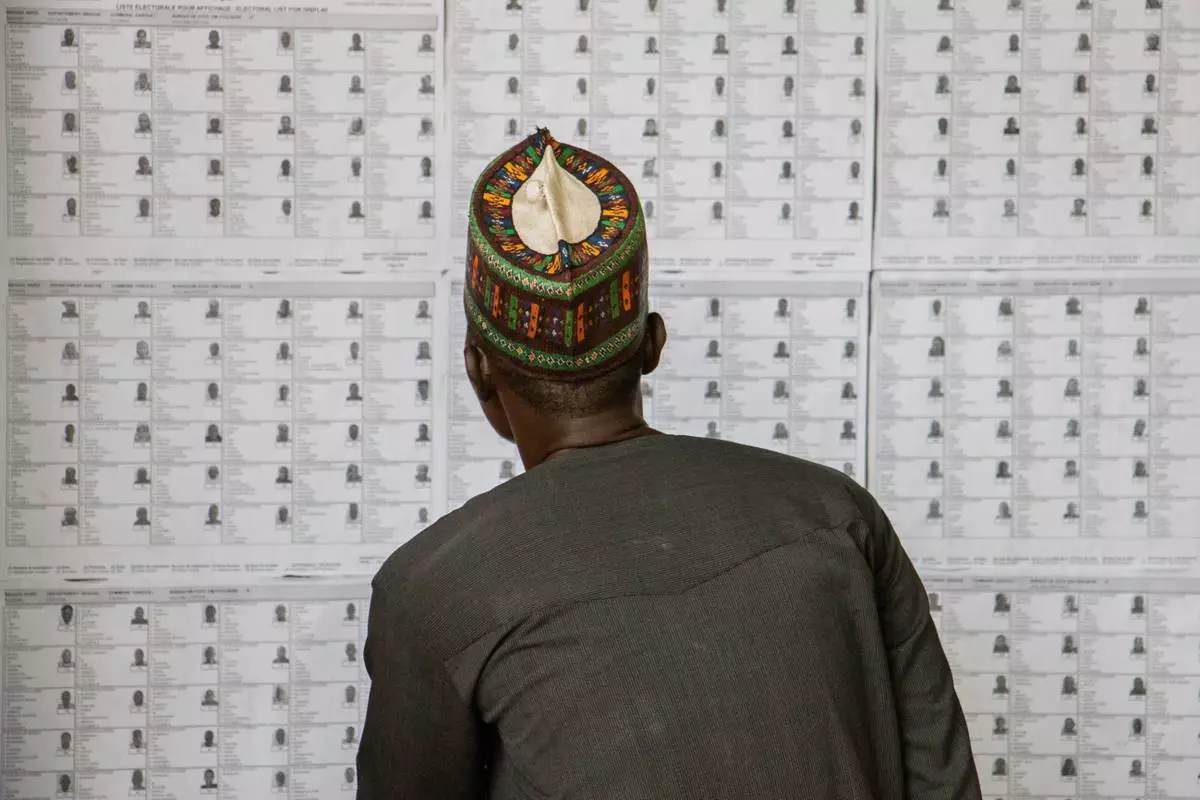 A voter checks his name on the voters' list before casting his ballot at a polling station in Garoua, Cameroon, Sunday, Oct. 12, 2025 (AP Photo/Welba Yamo Pascal)