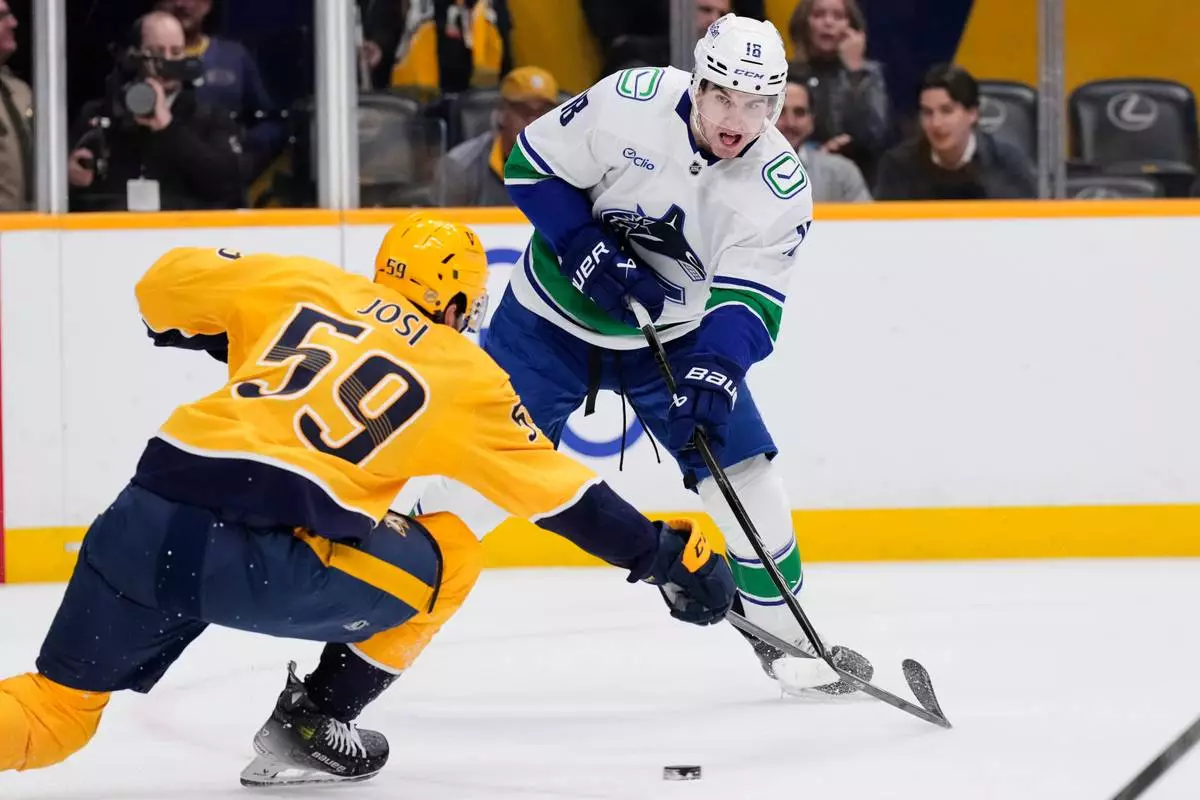 Vancouver Canucks left wing Drew O'Connor (18) shoots the puck past Nashville Predators defenseman Roman Josi (59) during the first period of an NHL hockey game Thursday, Oct. 23, 2025, in Nashville, Tenn. (AP Photo/George Walker IV)