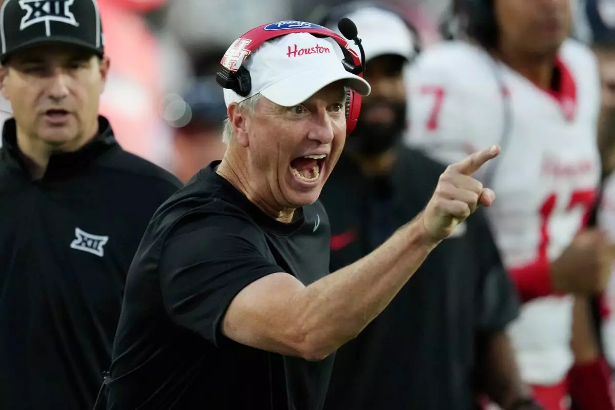 Houston head coach Willie Fritz celebrates a touchdown against Arizona State during the first half of an NCAA college football game Saturday, Oct. 25, 2025, in Tempe, Ariz. (AP Photo/Ross D. Franklin)