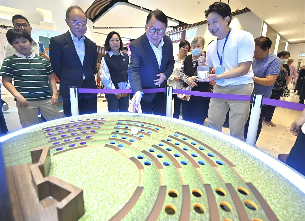 The Constitutional and Mainland Affairs Bureau (CMAB) is actively promoting the 2025 LCGE and debuting the "Election into Community" Roving Interactive Exhibition series this weekend. The first stop of the series was held in The Westwood for two consecutive days (October 25 and 26). Interactive games, an exhibition panel area and a self-service photo booth are set up at the event to deepen public understanding of electoral information. Life-sized mascots of the Ballot Box Family are also on site to interact with the public.