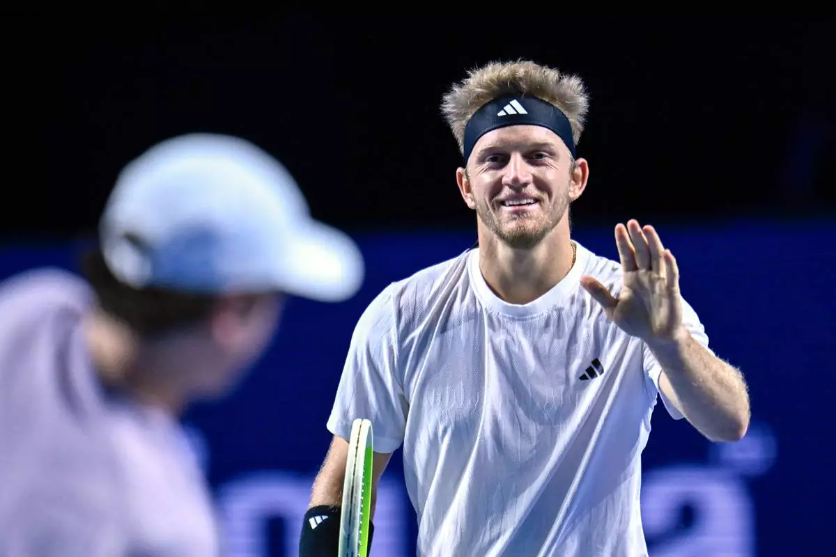 Spain's Alejandro Davidovich Fokina smiles during the final match against Brazil's Joao Fonseca at the Swiss Indoors tennis tournament in Basel, Switzerland, Sunday, Oct. 26, 2025. (Georgios Kefalas/Keystone via AP)