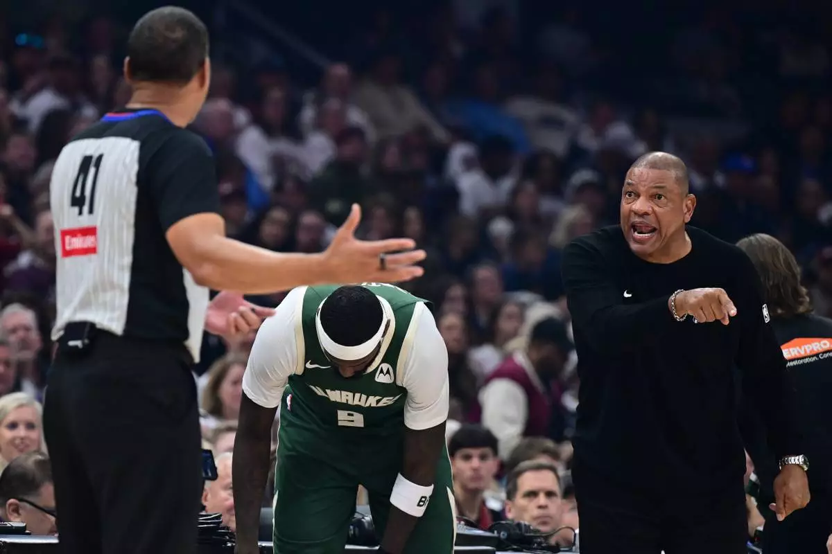Milwaukee Bucks head coach Doc Rivers, right, disputes a call with referee Nate Green, left, in the first half of an NBA basketball game against the Cleveland Cavaliers, Sunday, Oct. 26, 2025, in Cleveland. (AP Photo/David Dermer)
