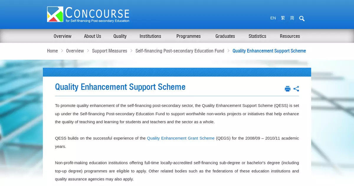 Further details of the QESS, including the scope of various project categories and the application procedures, are available at the Concourse for Self-financing Post-secondary Education (www.cspe.edu.hk/en/qess-project.html).