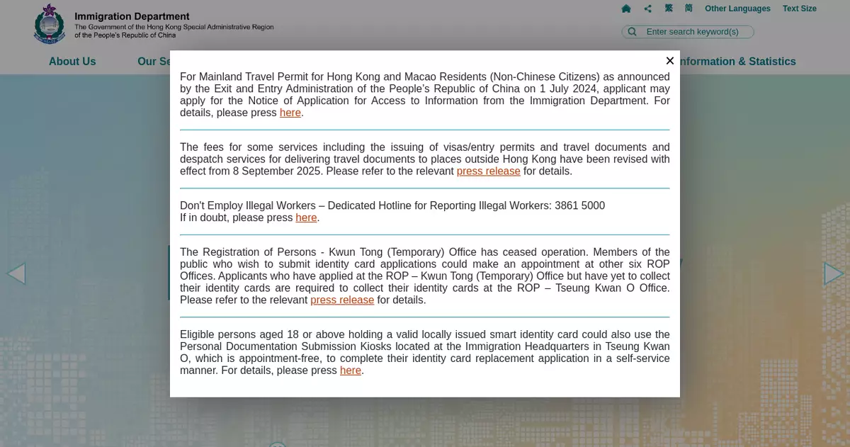The spokesman reiterated that it is a serious offence to employ people who are not lawfully employable. Under the Immigration Ordinance, the maximum penalty for an employer employing a person who is not lawfully employable, i.e. an illegal immigrant, a person who is the subject of a removal order or a deportation order, an overstayer or a person who was refused permission to land, has been significantly increased from a fine of $350,000 and three years' imprisonment to a fine of $500,000 and 10 years' imprisonment to reflect the gravity of such offences. The director, manager, secretary, partner, etc, of the company concerned may also bear criminal liability. The High Court has laid down sentencing guidelines that the employer of an illegal worker should be given an immediate custodial sentence.