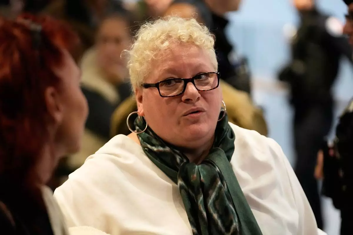 Defendant Delphine Jegousse known as Amandine Roy, arrives at the courtroom as ten people go on trial over cyberbullying of Brigitte Macron after they allegedly made "malicious" comments online spreading claims that President Emmanuel Macron 's wife is a man. Monday, Oct. 27, 2025 in Paris. (AP Photo/Michel Euler)