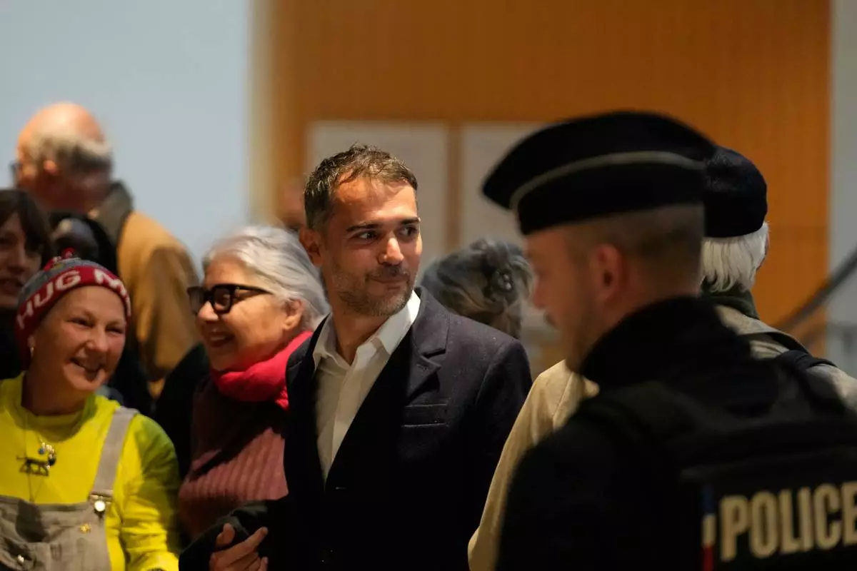 Defendant Aurelien Poirson-Atlan, center, arrives at the courtroom as ten people go on trial over cyberbullying of Brigitte Macron after they allegedly made "malicious" comments online spreading claims that President Emmanuel Macron 's wife is a man. Monday, Oct. 27, 2025 in Paris. (AP Photo/Michel Euler)