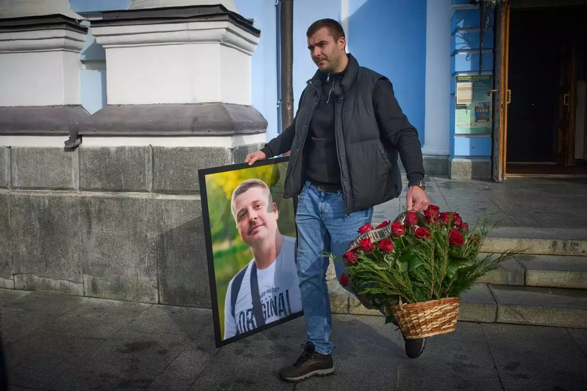 A man caries a photo of cameraman Yevhen Karmazin, who was killed together with corespondent Olena Hubanova, who worked under the pseudonym Alyona Gramova on Thursday, Oct. 23, when a Russian Lancet drone hit their vehicle in Ukraine's Kramatorsk around 20 kilometres from the front line, after funeral service at St. Michael Monastery in Kyiv, Ukraine, Monday, Oct. 27, 2025. (AP Photo/Efrem Lukatsky)