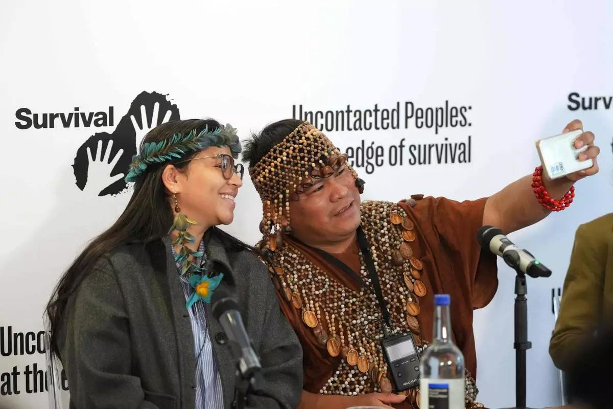 Maipatxi Apurina, left, and Herlin Odicio, right, take a photograph at the launch of Survival International's major new report on the world's uncontacted Indigenous peoples, in London, Monday, Oct. 27, 2025. (AP Photo/Kirsty Wigglesworth)