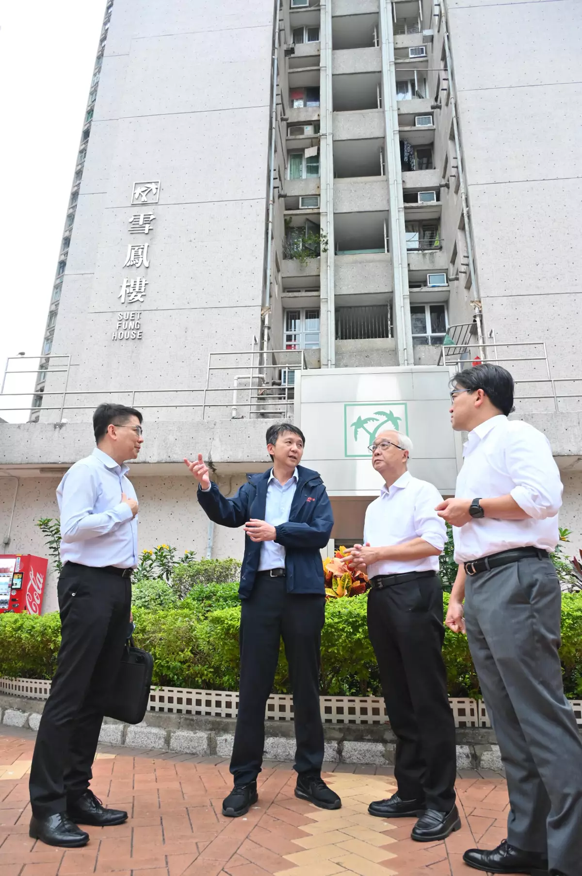 The Secretary for Environment and Ecology, Mr Tse Chin-wan, accompanied by the Director of Food and Environmental Hygiene, Mr Donald Ng; Assistant Director (Operations) of the Food and Environmental Hygiene Department (FEHD), Mr Tsoi Ka-wai, and representatives from relevant departments, inspected the enhanced preventive work against chikungunya fever (CF) in Fung Tak Estate in Wong Tai Sin and the surrounding area this afternoon (October 27).