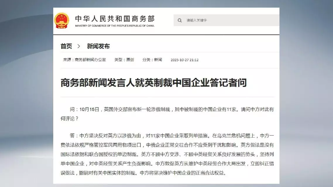 China firmly opposes British sanctions targeting Chinese enterprises under "Russia-related" pretext
