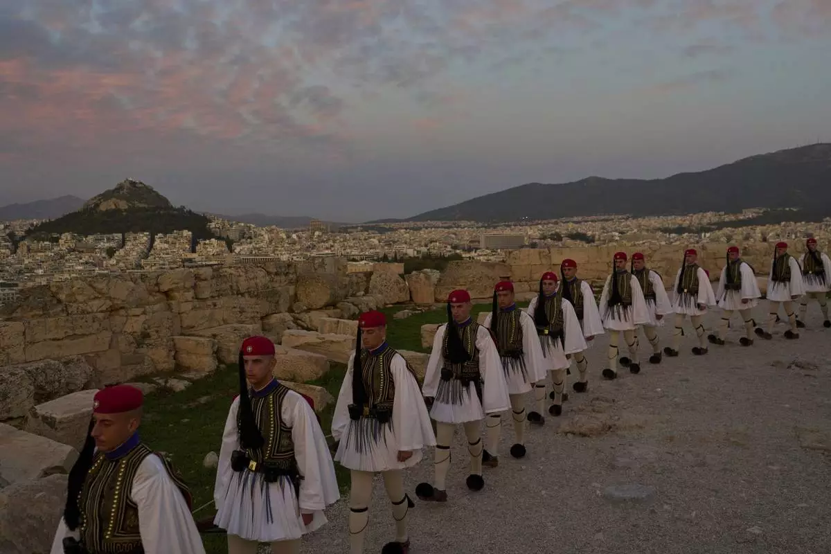 Presidential guards walk on the ancient Acropolis hill after the lowering of the Greek flag, as the city of Athens is seen in the background, on Sunday, Oct. 26, 2025. (AP Photo/Petros Giannakouris)