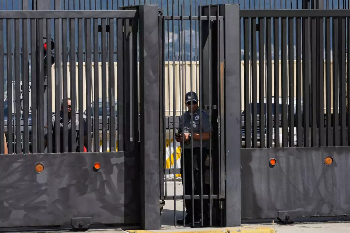 Security officers stand behind the main gate of the United States embassy in Caracas, Venezuela, Monday, Oct. 27, 2025. (AP Photo/Ariana Cubillos)