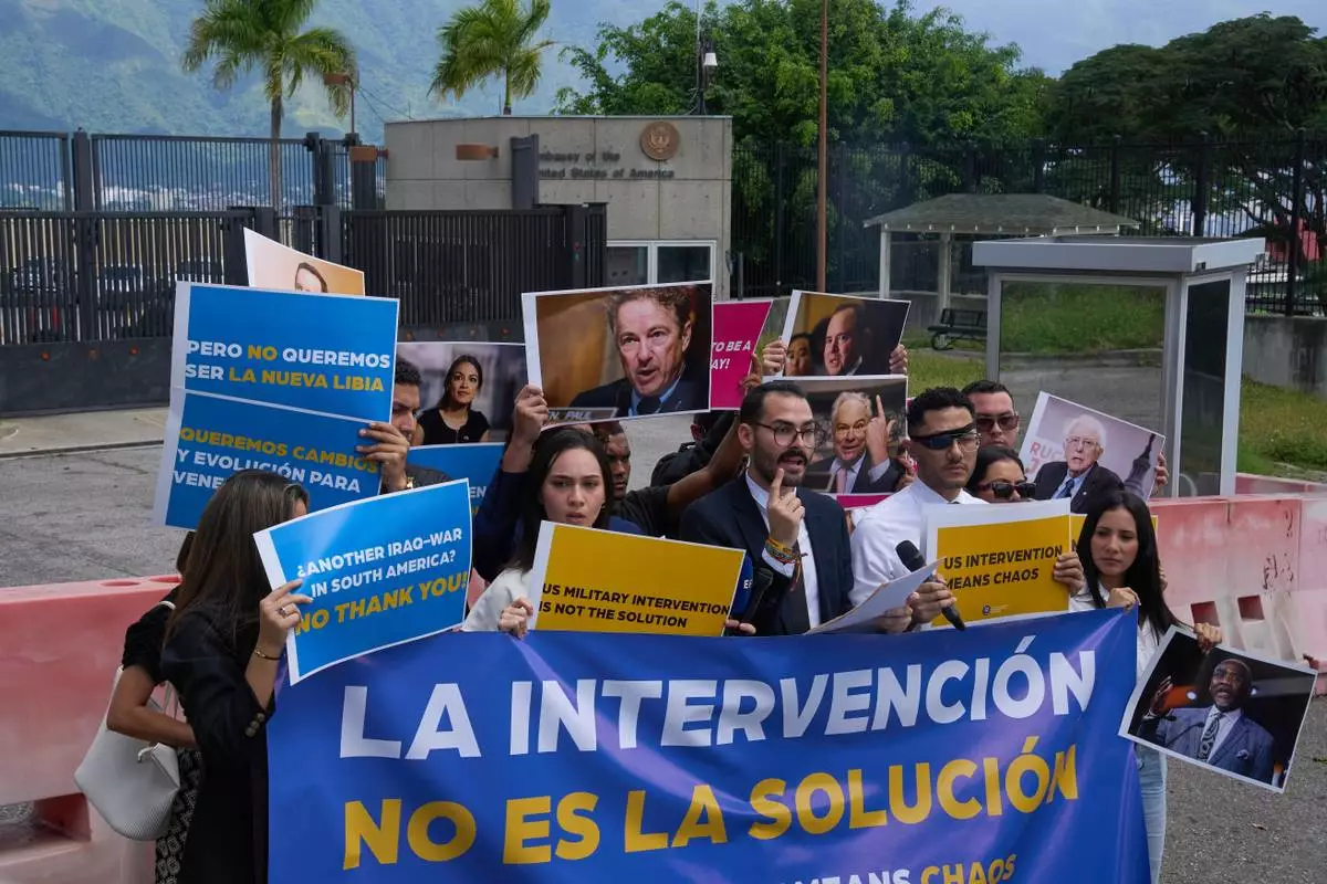 Gabriel Cabrera, president of the Venezuelan Youth Center for Democracy, gives a statement outside of the U.S. embassy with members of the organization holding signs that read in Spanish "Intervention is not the solution," in reference to U.S. warships operating in the Caribbean, in Caracas, Venezuela, Monday, Oct. 27, 2025. (AP Photo/Ariana Cubillos)