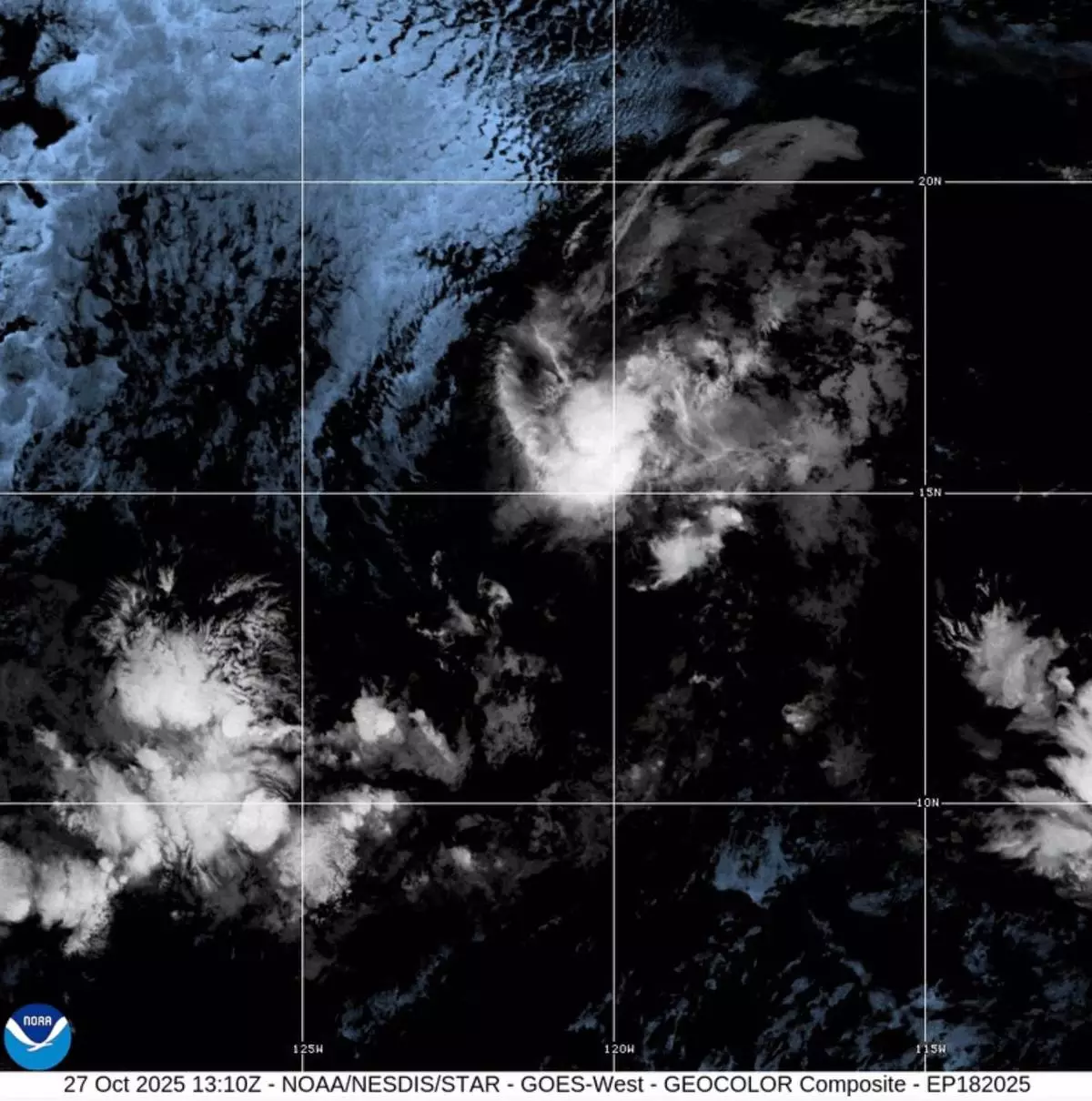 This satellite image provided by the National Oceanographic and Atmospheric Administration shows Tropical Storm Sonia, Monday, Oct. 27, 2025. (NOAA via AP)