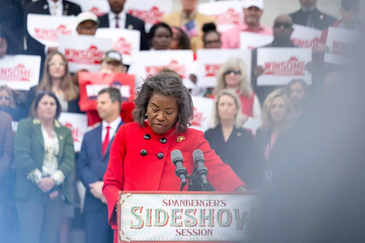 Republican gubernatorial candidate and current Lt. Gov. Winsome Earle-Sears speaks during a news conference on the steps of the Virginia Capitol Building, Monday, Oct. 27, 2025, in Richmond, Va. (Mike Kropf/Richmond Times-Dispatch via AP)