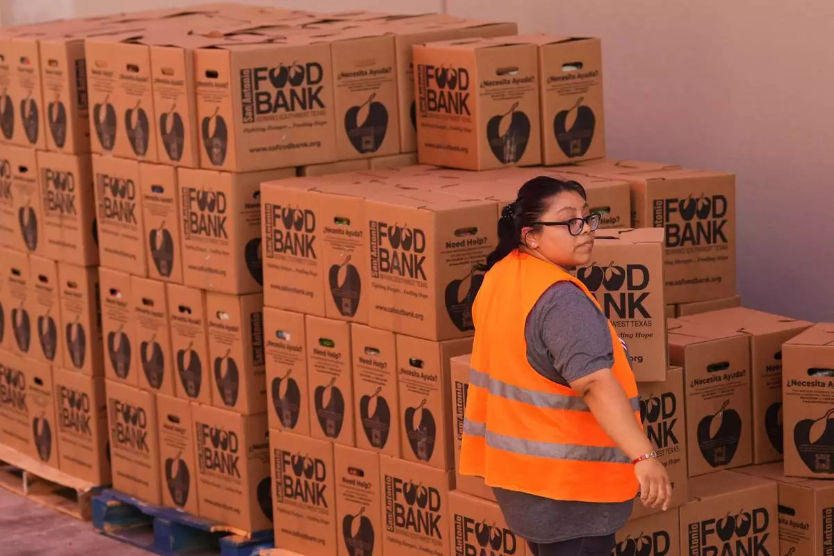 Volunteer Cindy Leiva helps load a vehicle during a food distribution targeting federal employee households affected by the federal shutdown as well as SNAP recipients, Monday, Oct. 27, 2025, in San Antonio. (AP Photo/Eric Gay)