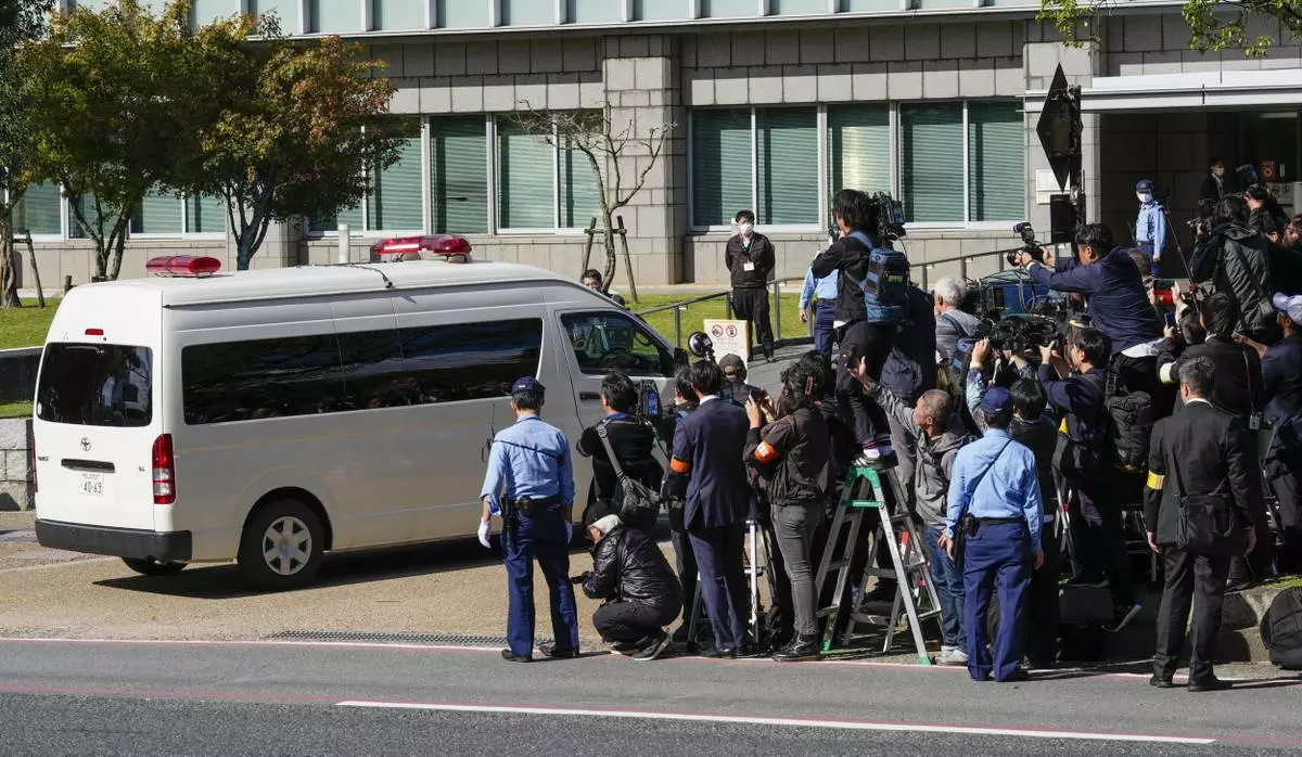 Journalists crowd as a vehicle which is belived to be carrying Tetsuya Yamagami, the accused killer of former Japanese Prime Minister Shinzo Abe, arrives for a trial at the Nara District Court in Nara, western Japan Tuesday, Oct. 28, 2025. (Shohei Miyano/Kyodo News via AP)