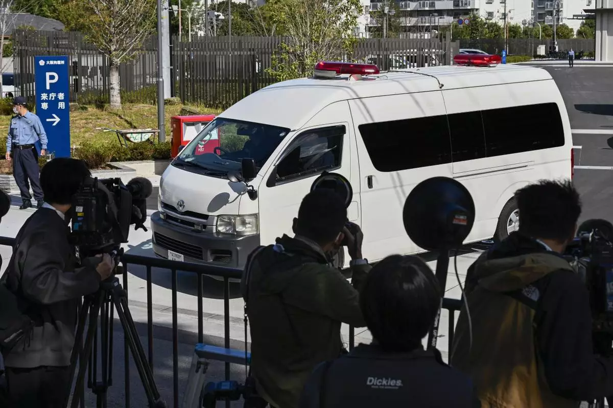 Journalists crowd as a vehicle which is belived to be carrying Tetsuya Yamagami, the accused killer of former Japanese Prime Minister Shinzo Abe, leaves a detention center in Osaka, western Japan for a trial Tuesday, Oct. 28, 2025. (Kyodo News via AP)