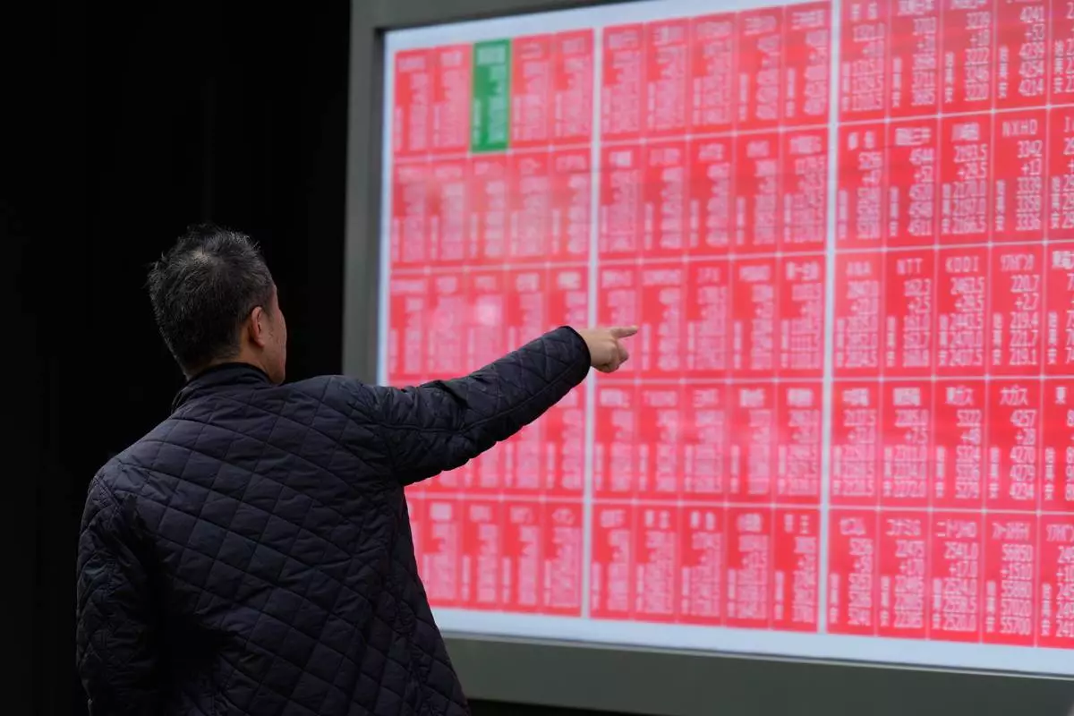 A person loots at an electronic stock board showing Japan's Nikkei index at a securities firm Monday, Oct. 27, 2025, in Tokyo. (AP Photo/Eugene Hoshiko)