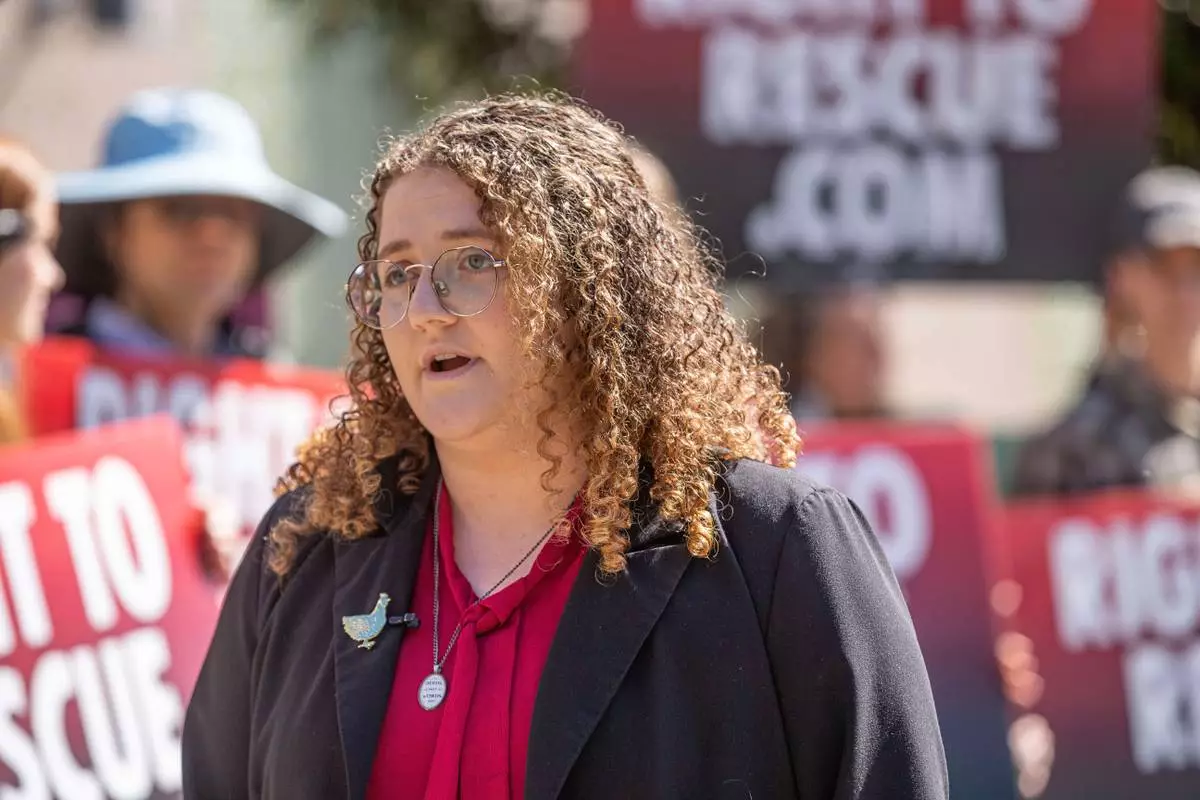 Animal rights activist Zoe Rosenberg talks to reporters outside the Sonoma County Superior Courthouse before her preliminary hearing May 3, 2024, in Santa Rosa, Calif. (Chad Surmick/The Press Democrat via AP)
