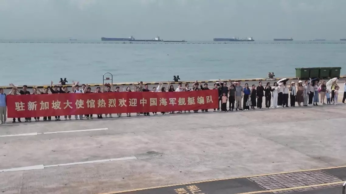 The taskforce, consisting of Chinese PLA Navy's training ship Qi Jiguang and comprehensive landing ship Yimengshan, docked at the Changi Naval Base, receiving a warm welcome by the Republic of Singapore Navy, Chinese Embassy staff in Singapore and local student representatives.