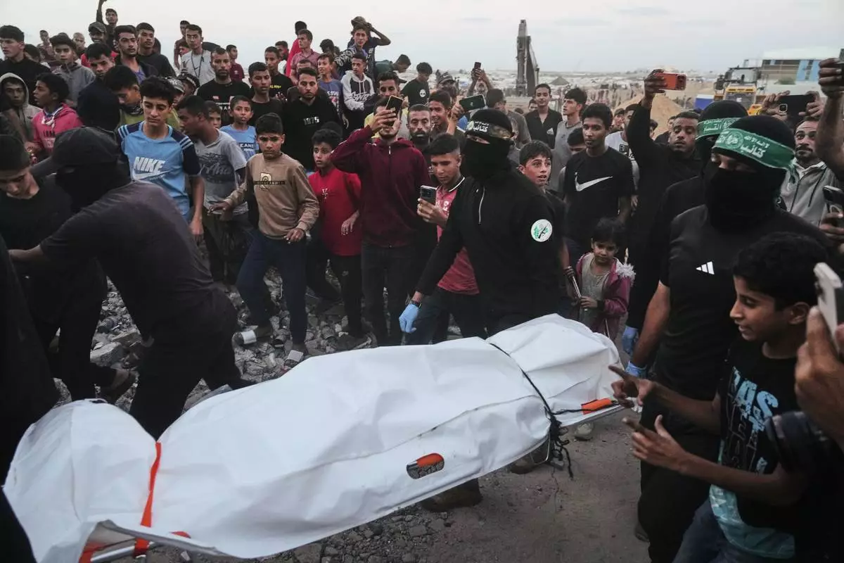 Hamas militants carry a white bag believed to contain a body, after retrieving it from a tunnel during a search for the remains of hostages in Hamad City, Khan Younis, in southern Gaza, Tuesday, Oct. 28, 2025. (AP Photo/Jehad Alshrafi)