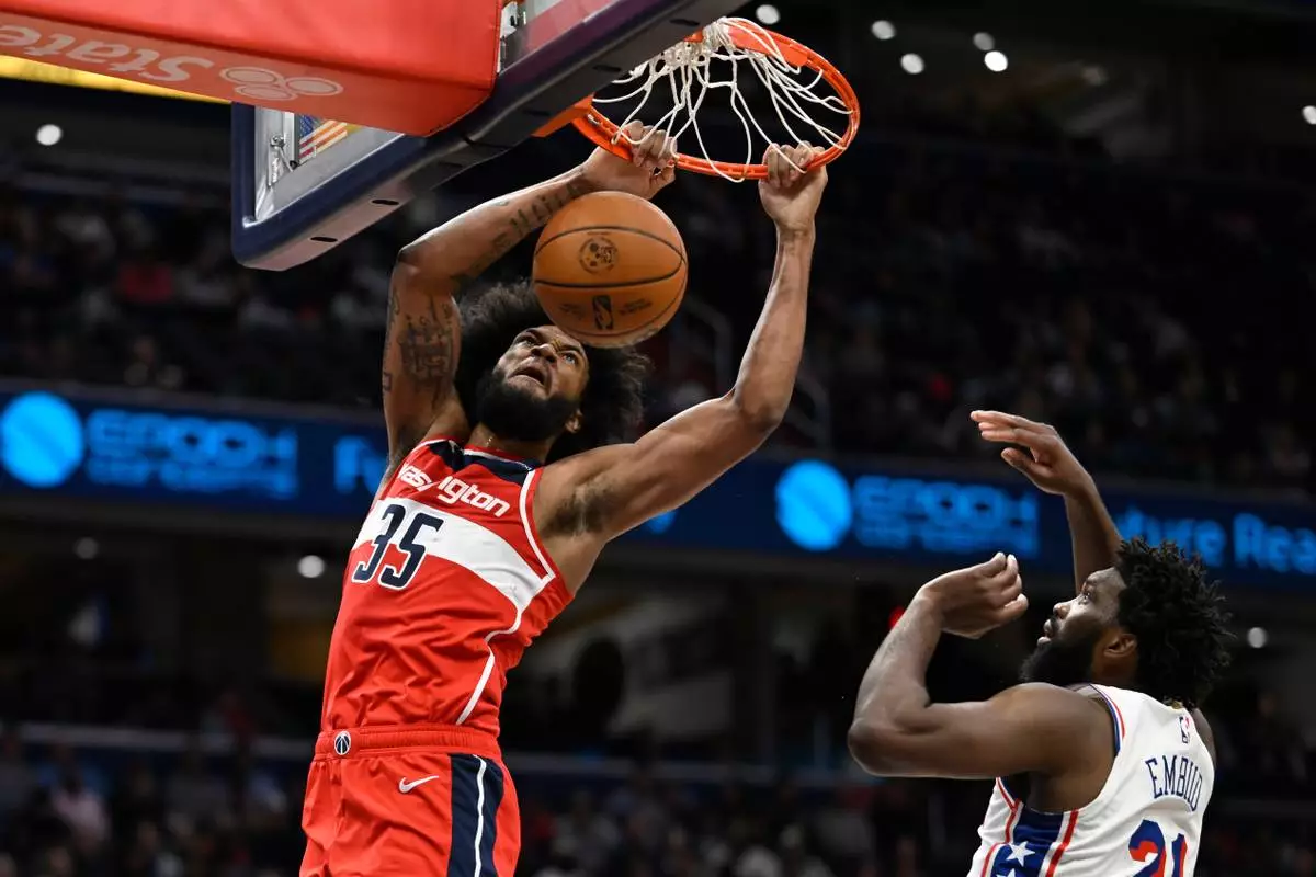 Washington Wizards forward Marvin Bagley III (35) dunks against Philadelphia 76ers center Joel Embiid during the first half of an NBA basketball game Tuesday, Oct. 28, 2025, in Washington. (AP Photo/John McDonnell)