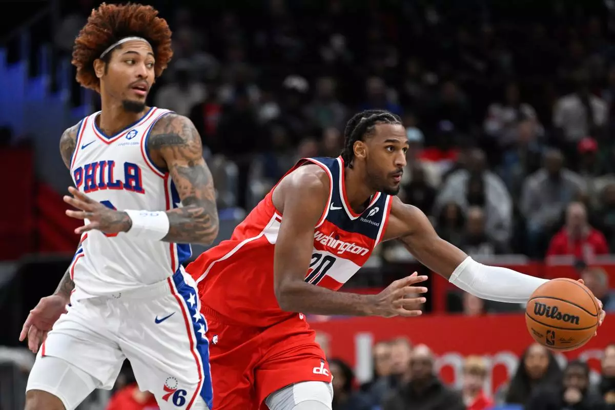 Philadelphia 76ers guard Kelly Oubre Jr., left, watches Washington Wizards center Alex Sarr pass off during the first half of an NBA basketball game Tuesday, Oct. 28, 2025, in Washington. (AP Photo/John McDonnell)