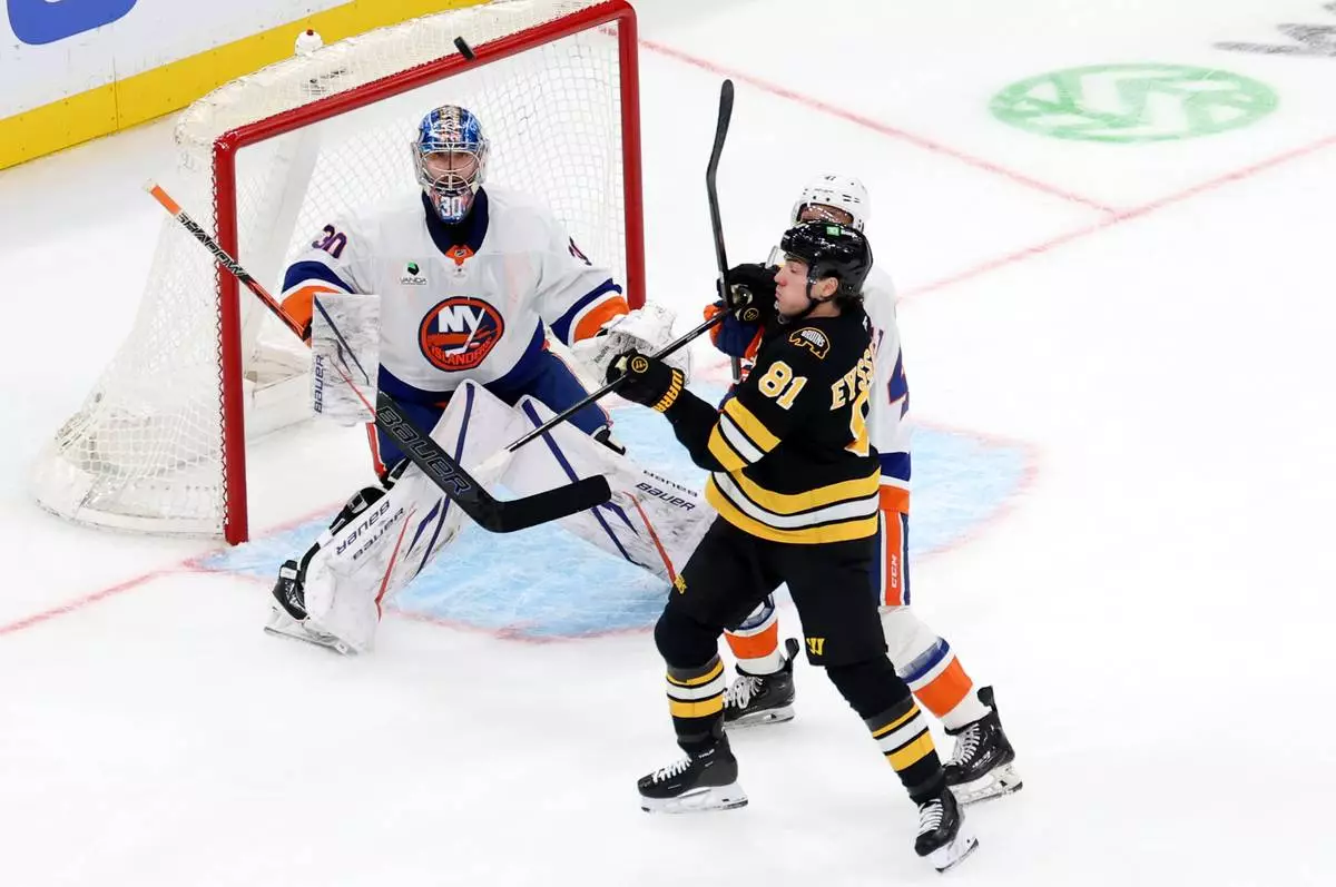 Boston Bruins center Michael Eyssimont (81) attempts to score against New York Islanders goaltender Ilya Sorokin (30) during the second period of an NHL hockey game, Tuesday, Oct. 28, 2025, in Boston. (AP Photo/Mark Stockwell)