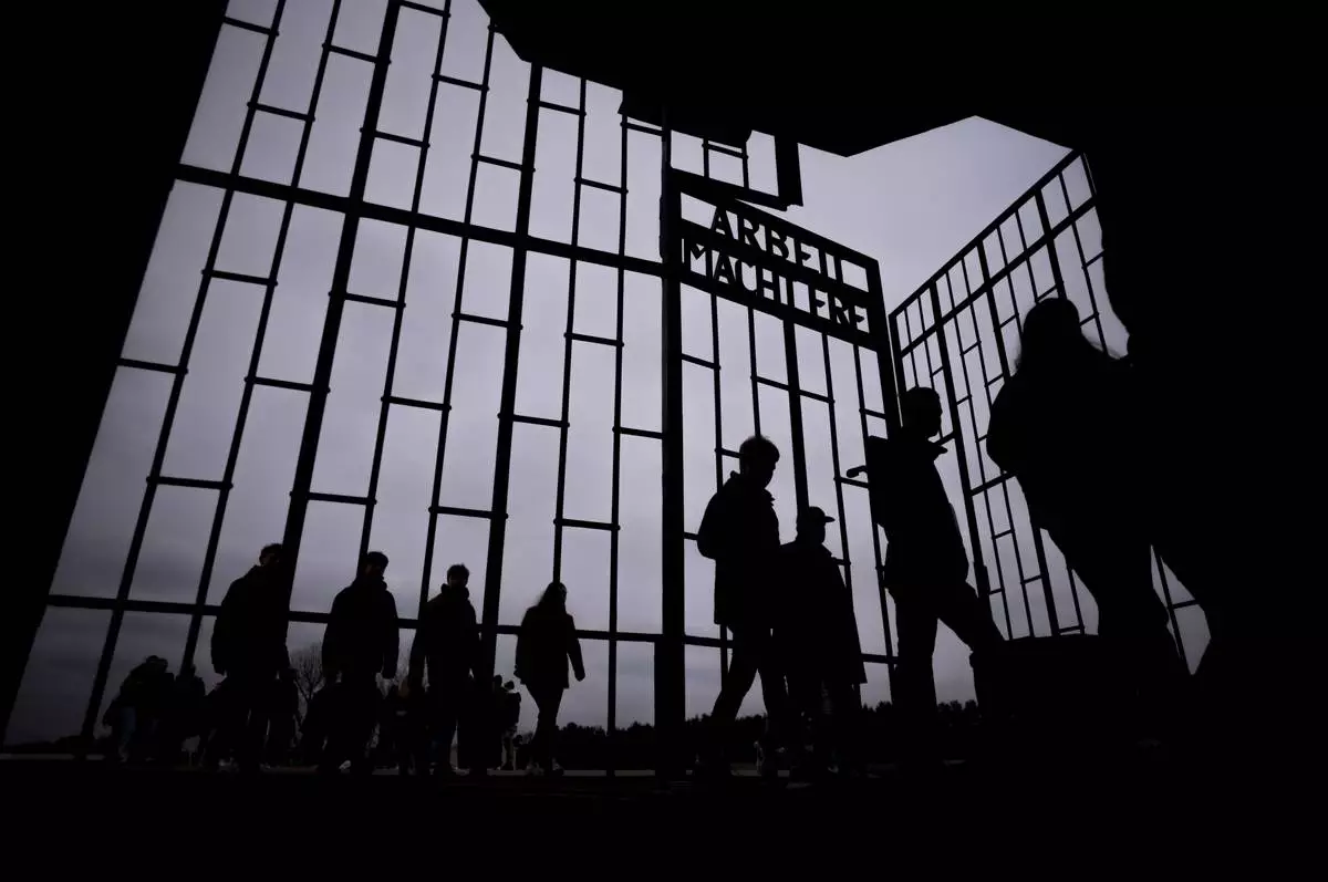 FILE - People walk through the gate with the inscription "Arbeit Macht Frei" of the Nazi concentration camp Sachsenhausen in Oranienburg, Germany, April 18, 2023. (AP Photo/Markus Schreiber, File)