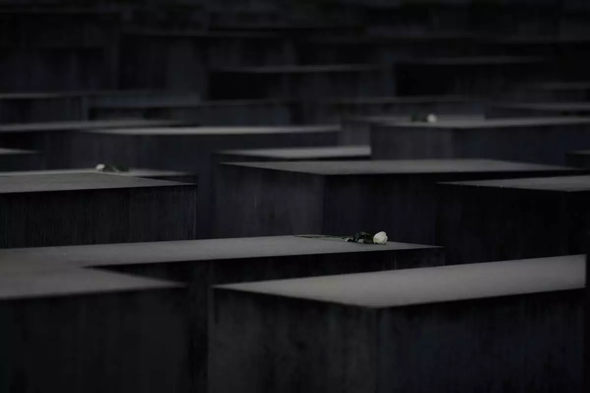 White roses lay on concrete slabs of the Holocaust Memorial in Berlin, Germany, Tuesday, Oct. 28, 2025. (AP Photo/Markus Schreiber)
