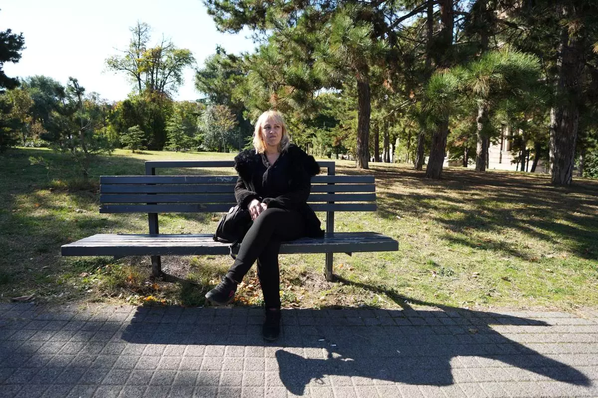 Diana Hrka, the mother of Stefan Hrka, a young man who died when the canopy of the railway station in Novi Sad fell reacts during an interview with The Associated Press, in Belgrade, Serbia, Tuesday, Oct. 14, 2025. (AP Photo/Darko Vojinovic)