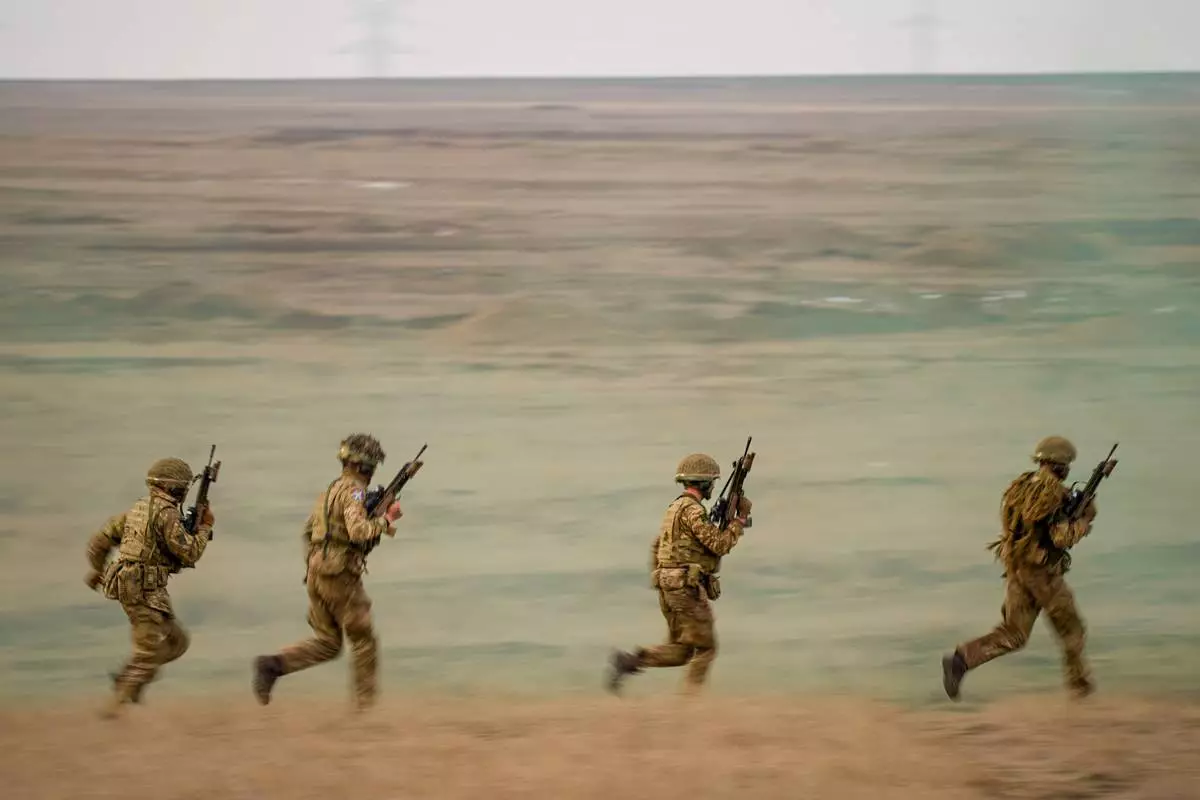 FILE- Servicemen run during the Steadfast Dart 2025 exercise, involving some 10,000 troops in three different countries from nine nations, representing the largest NATO operation planned this year, at a training range in Smardan, eastern Romania, Wednesday, Feb. 19, 2025. (AP Photo/Vadim Ghirda, file)