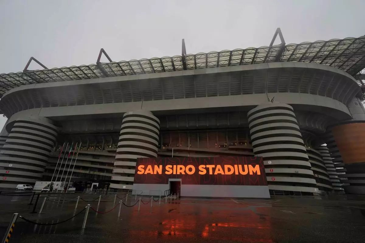 FILE - Rain falls on San Siro Stadium, venue for the opening ceremony of the Milan Cortina 2026 Winter Olympics, in Milan, Italy, Monday, Jan. 27, 2025. (AP Photo/Luca Bruno, File)
