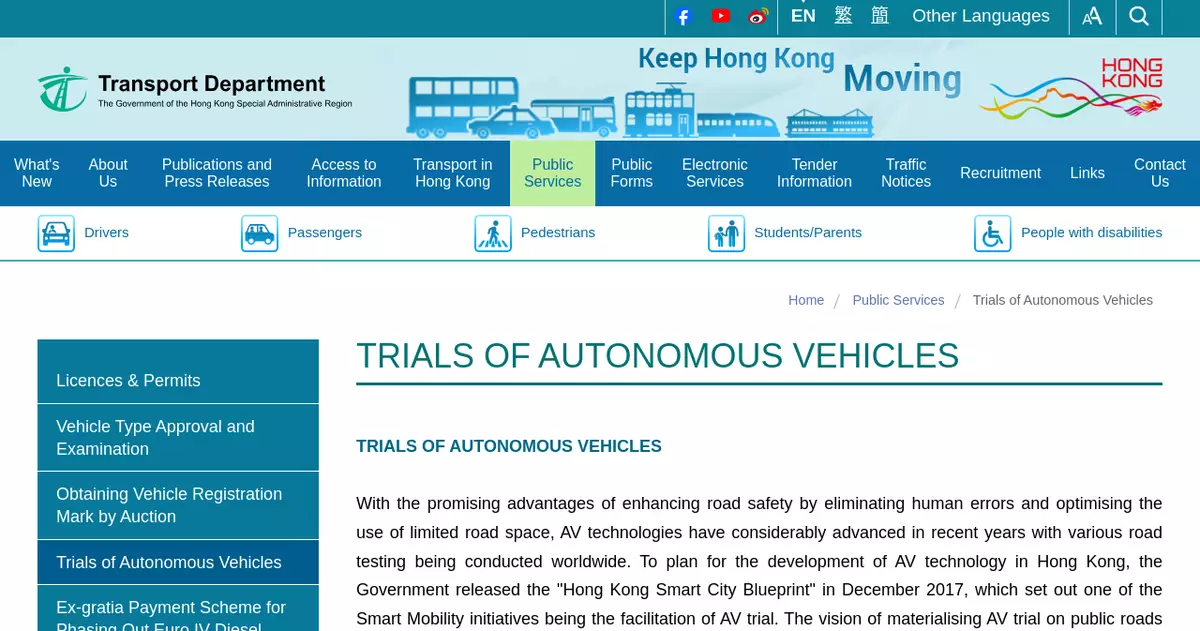 The Policy Address 2025 set out the promotion of AVs. The Government will continue to facilitate the industry to conduct AV trials and applications across various communities, aiming to accelerate progress towards driverless and large-scale development. The Government also aspires to achieve commercial operation, encouraging the industry to leverage Hong Kong as a platform to explore overseas markets, particularly those with right-hand drive systems. Driving and road safety remain the top priority, and the Government will draw on practical experience to refine technical standards, share research findings with the industry in a timely manner, and implement these initiatives in a prudent and orderly process.