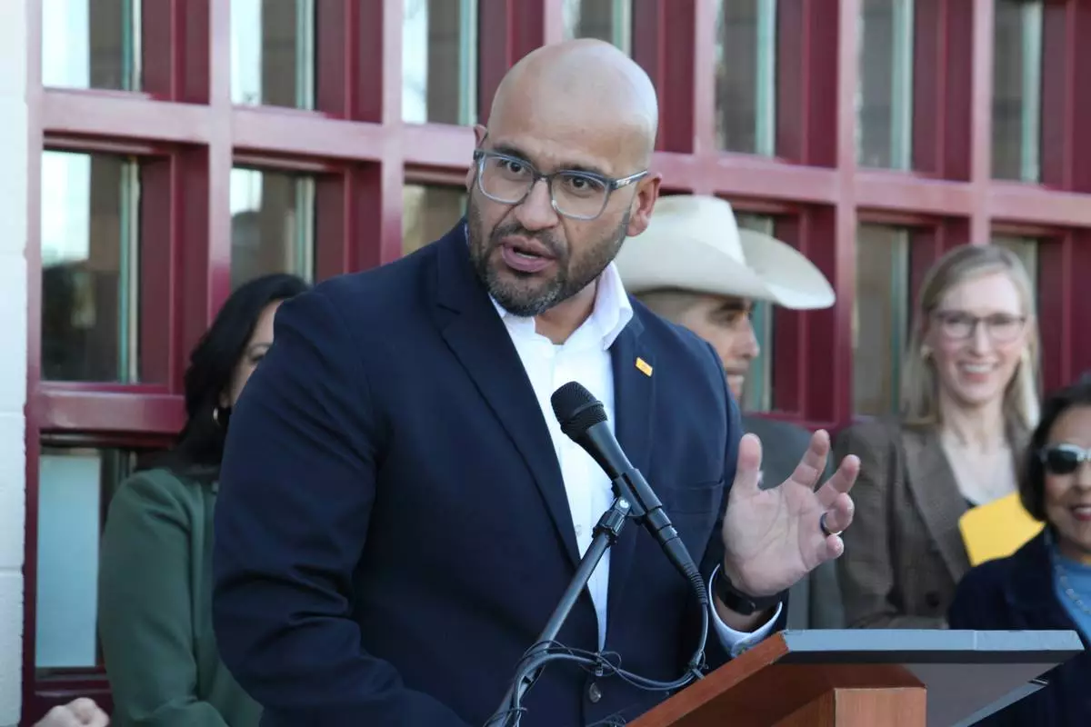 New Mexico House Speaker Javier Martinez talks about state efforts to temporarily backfill SNAP benefits during a news conference outside a grocery store in Albuquerque, New Mexico, on Wednesday, Oct. 29, 2025. (AP Photo/Susan Montoya Bryan)