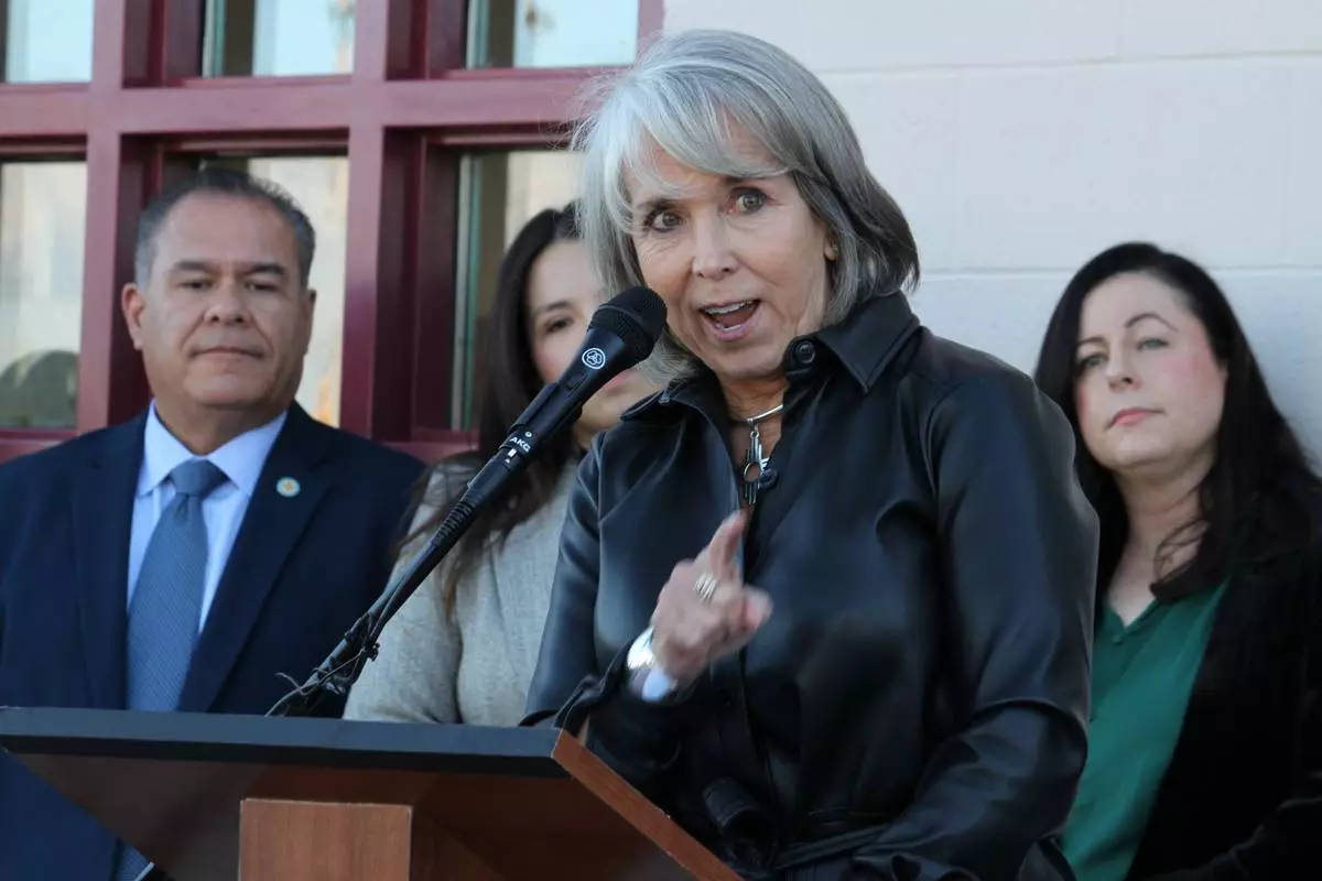 New Mexico Gov. Michelle Lujan Grisham, center, is flanked by state lawmakers as she announces the state will temporarily backfill SNAP benefits during a news conference outside a grocery store in Albuquerque, New Mexico, on Wednesday, Oct. 29, 2025. (AP Photo/Susan Montoya Bryan)