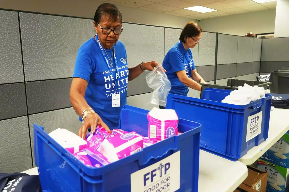 Volunteers put together feminine hygiene packages for those affected by Hurricane Melissa in Jamaica Thursday, Oct. 30, 2025, at Food for the Poor in Coconut Creek, Fla. (AP Photo/Marta Lavandier)
