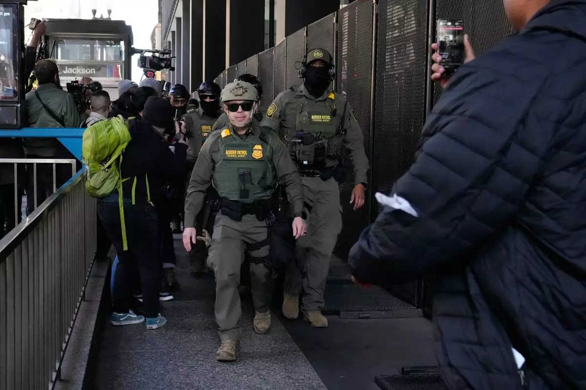 U.S. Customs and Border Patrol agents arrive to escort U.S. Customs and Border Patrol Gregory Bovino from federal court in Chicago, Tuesday, Oct. 28, 2025. (AP Photo/Nam Y. Huh)