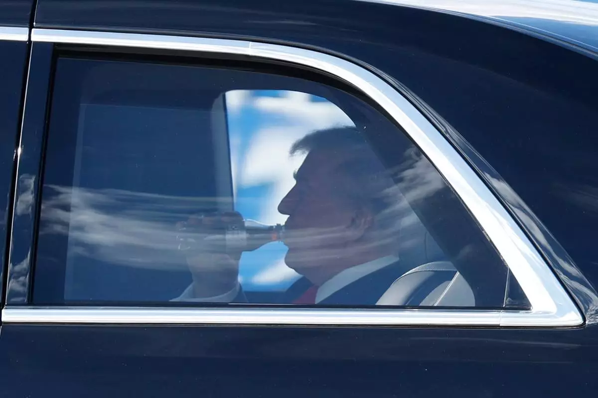 President Donald Trump is seen in his limousine, known as "The Beast," upon his arrival at Joint Base Andrews, Md., Friday, Oct. 31, 2025, en route to his Mar-a-Lago estate in Palm Beach, Fla. (AP Photo/Luis M. Alvarez)
