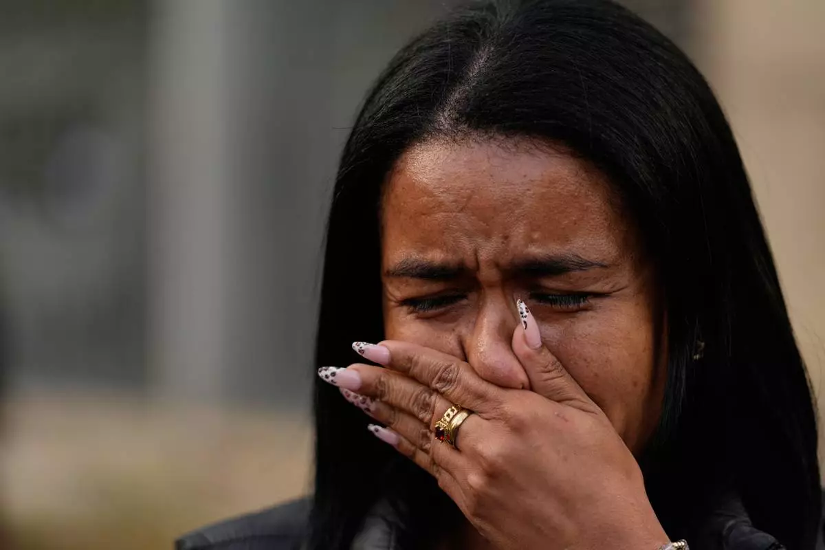 Narwin Gil cries as she waits for news of her detained sister, Marylyn Gil, outside El Helicoide, headquarters of Venezuela's intelligence service and a detention center, in Caracas, Venezuela, Saturday, Jan. 10, 2026. (AP Photo/Matias Delacroix)