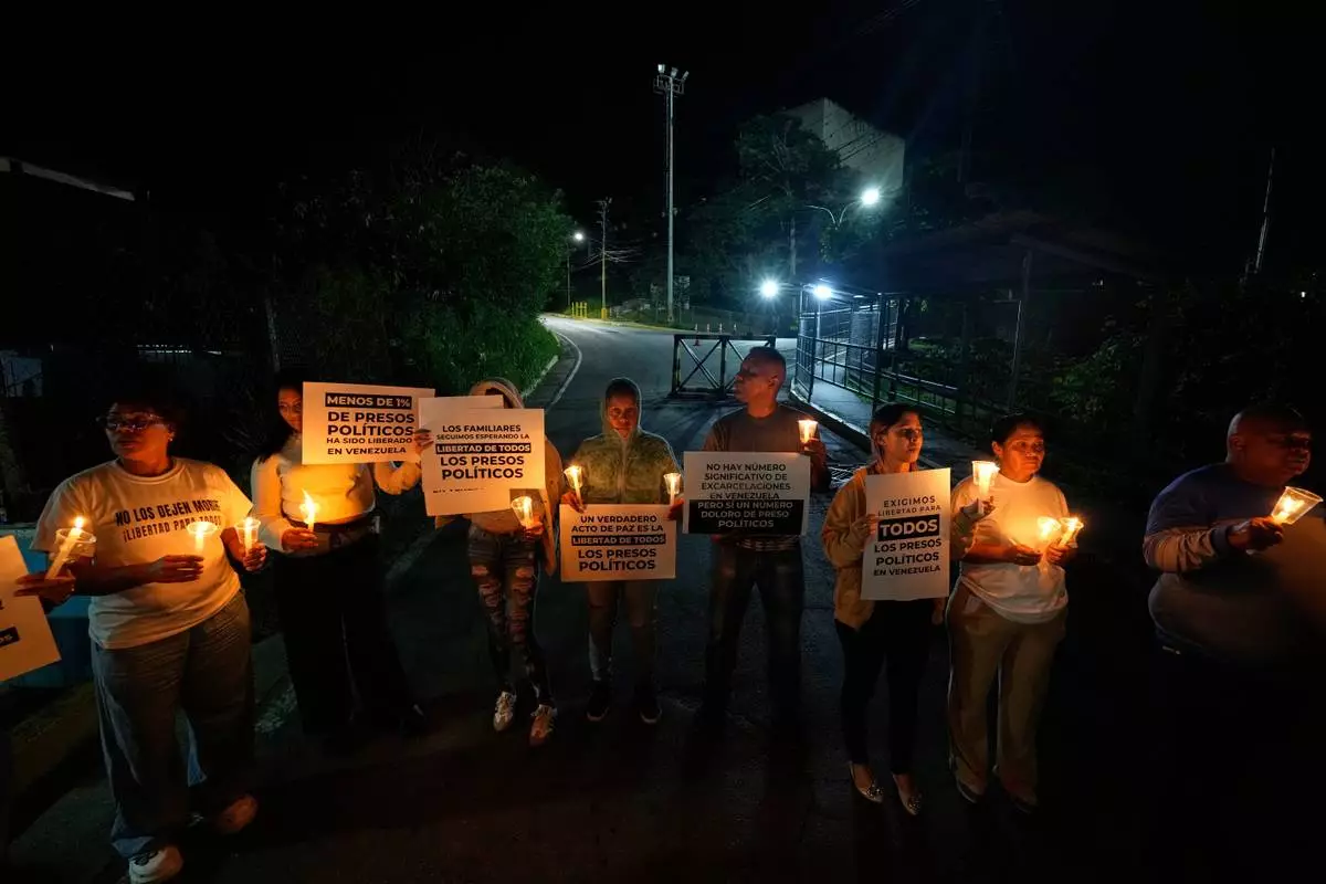 Relatives and friends of political prisoners hold banners and candles calling for their loved ones to be set free outside the Rodeo I prison in Guatire, Venezuela, Friday, Jan. 9, 2026 after the government announced prisoners would be released. (AP Photo/Matias Delacroix)