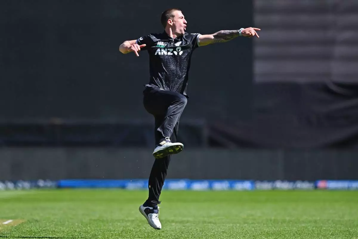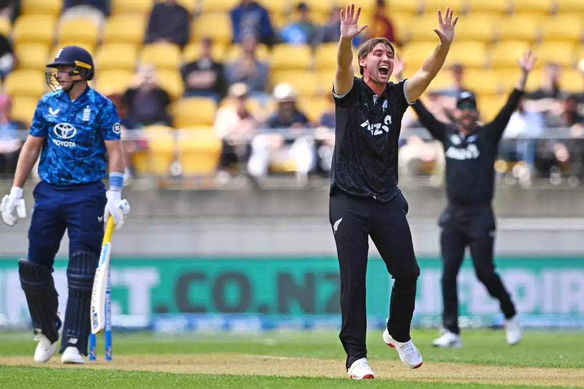 Blair Tickner of New Zealand reacts after he dismissed Sam Curran of England during the One Day International cricket match between New Zealand and England in Wellington, New Zealand, Saturday, Nov. 1, 2025. (Kerry Marshall/Photosport via AP)