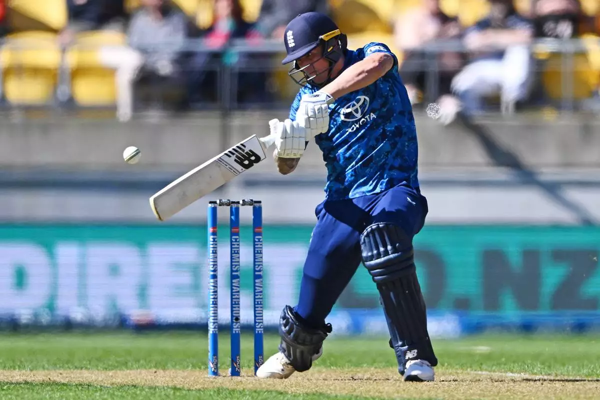 Brydon Carse of England bats during the One Day International cricket match between New Zealand and England in Wellington, New Zealand, Saturday, Nov. 1, 2025. (Kerry Marshall/Photosport via AP)